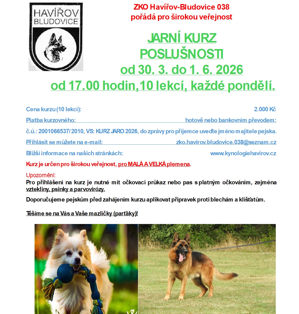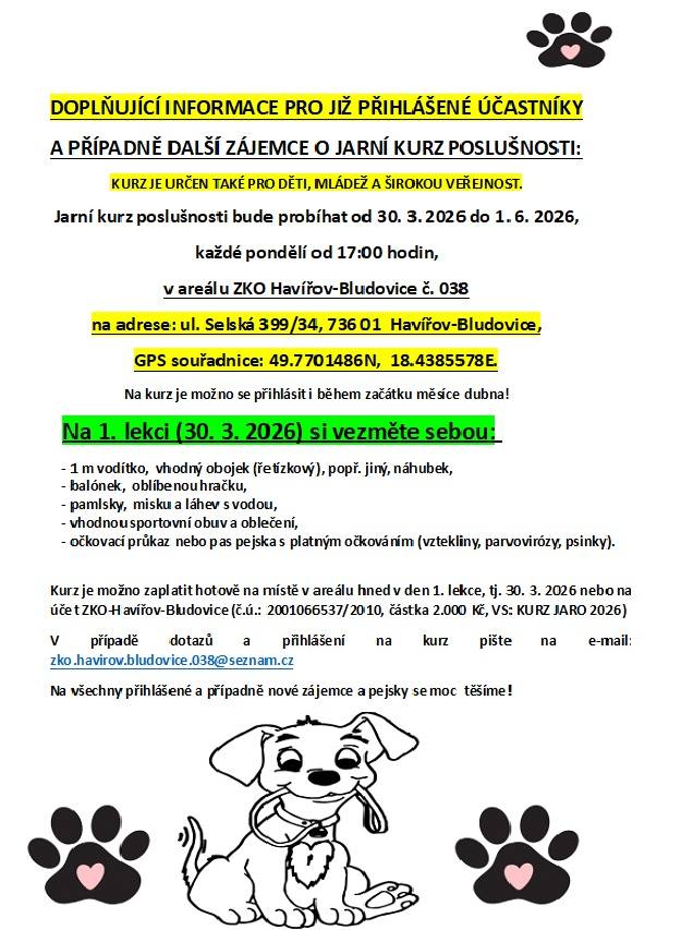 Na jarní kurz poslušnosti jsou vítány děti, mládež a široká veřejnost města Havířova a okolí! Vhodné pro všechny pejsky včetně štěňátek a začínajících psovodů!